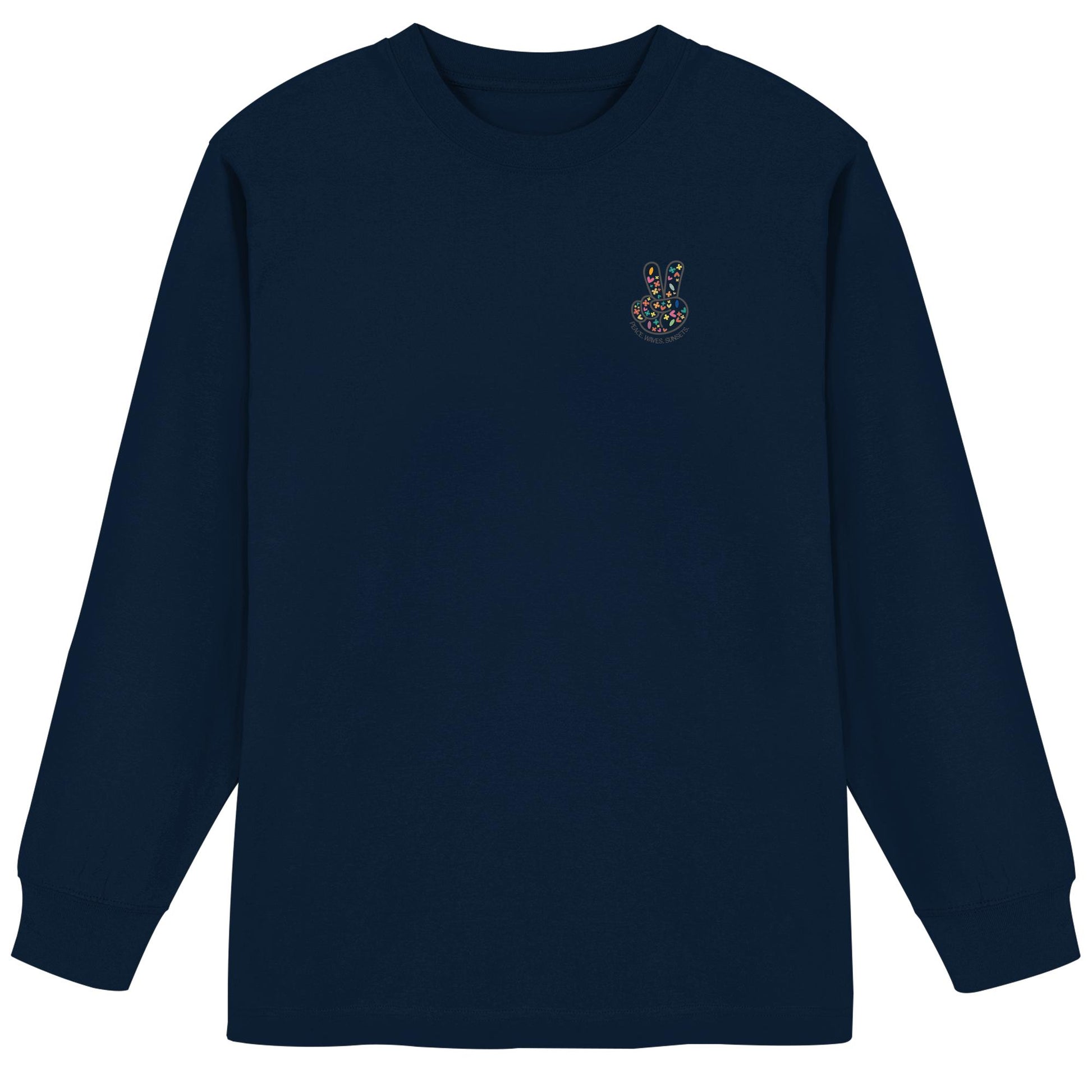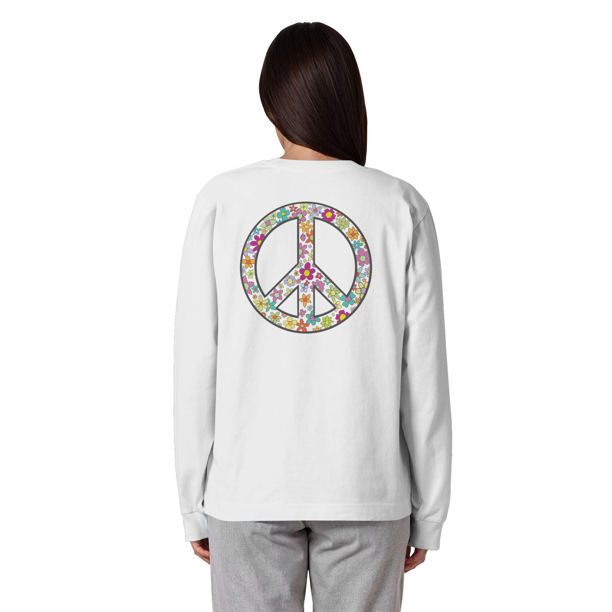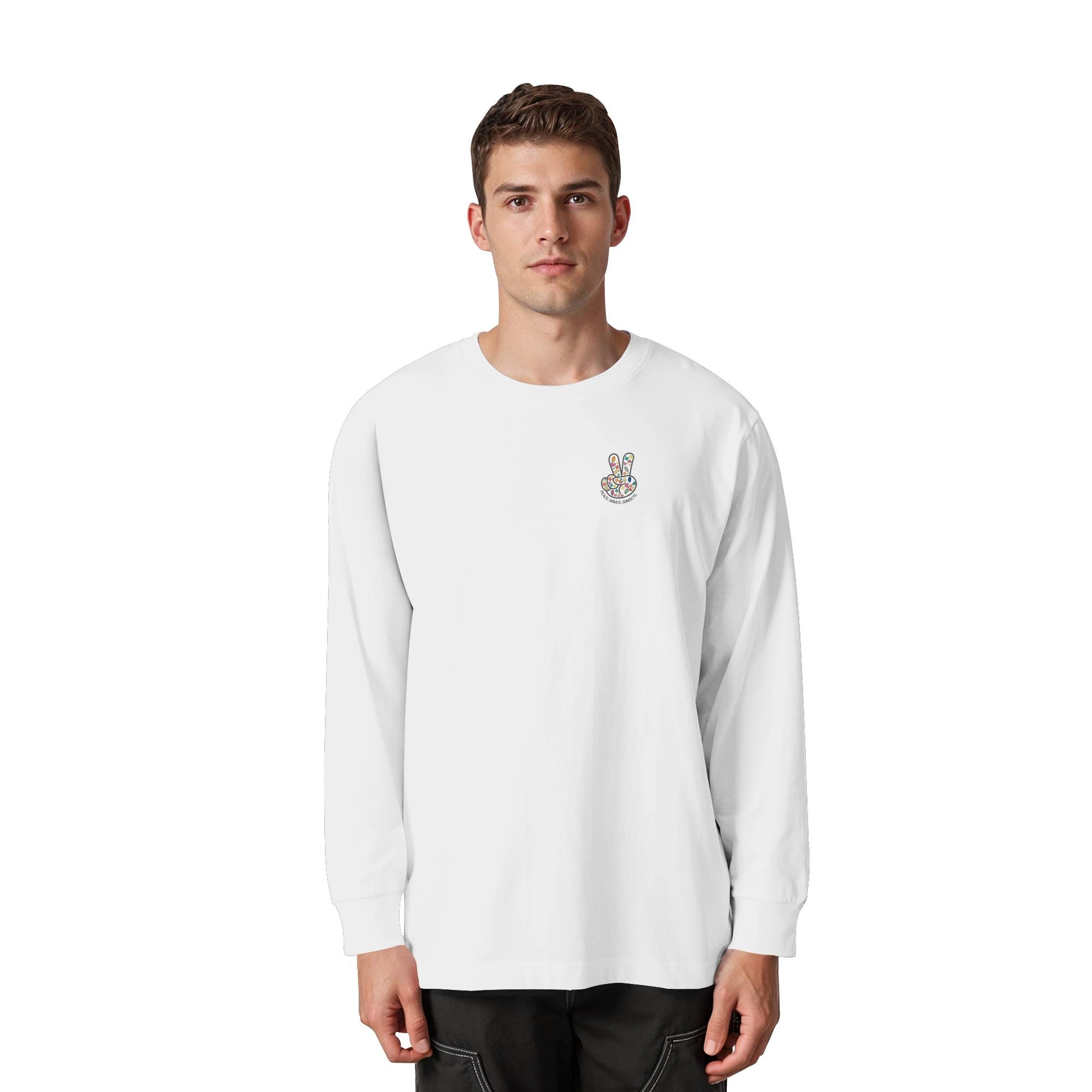 Erleben Sie den Zauber von Frieden, Wellen und Sonnenuntergängen mit unserem "Peace. Waves. Sunsets." - Organisches Oversize Longsleeve T-Shirt. Dieses einzigartige Design kombiniert florale und herzförmige Motive in harmonischen Farben, die Wärme und Gelassenheit ausstrahlen.