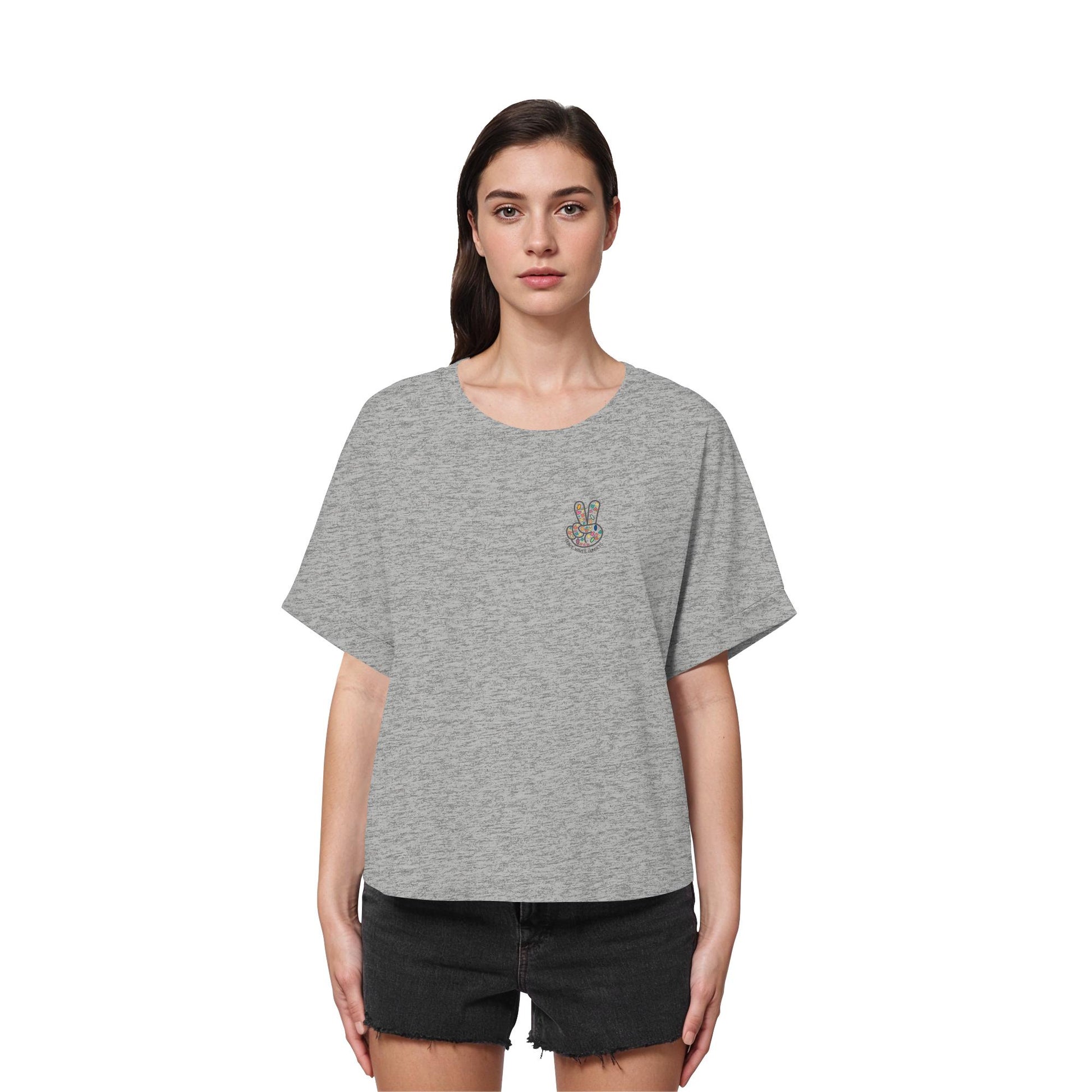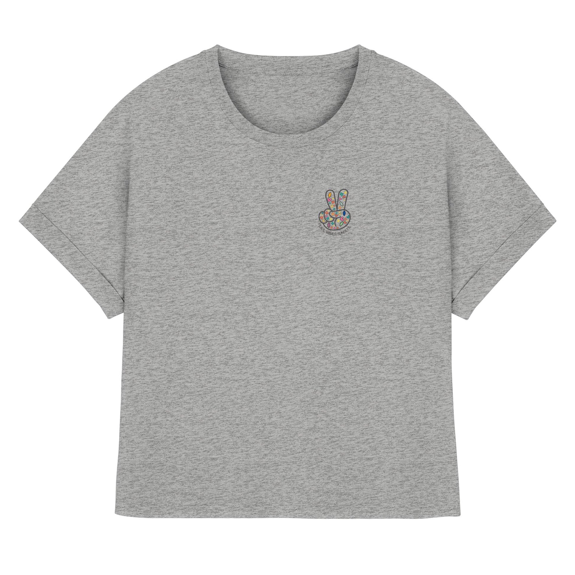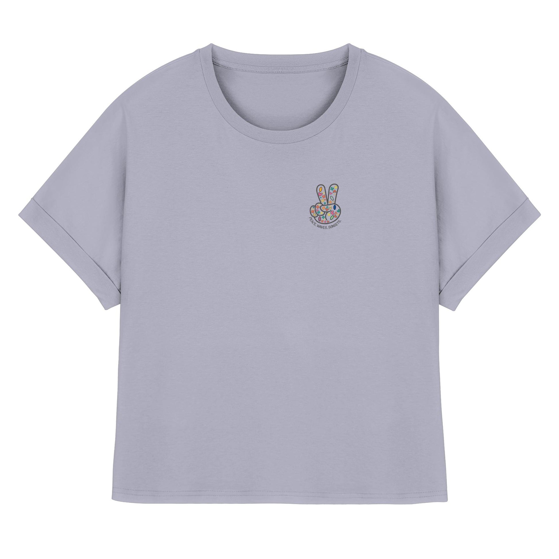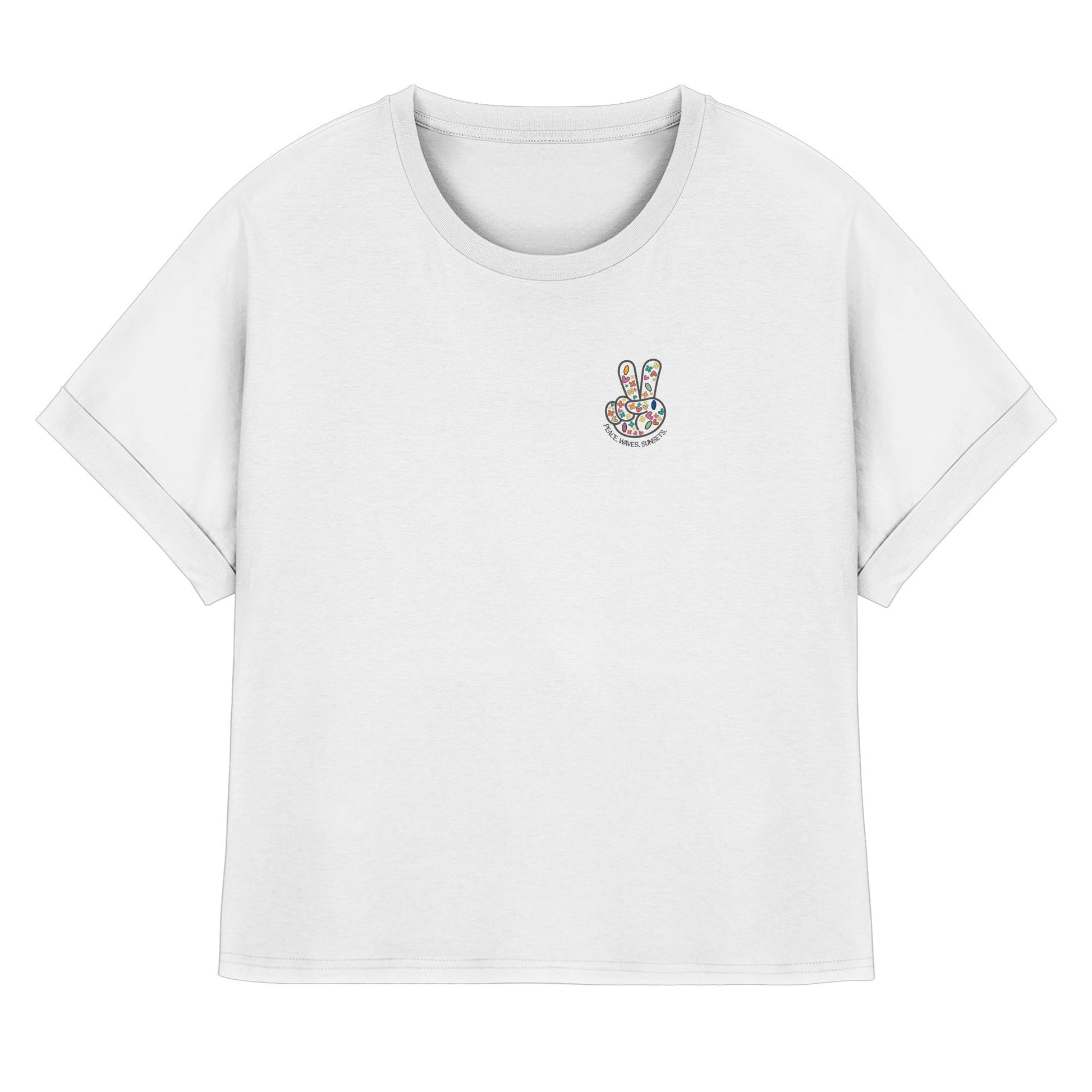 Erlebe die Magie von Frieden, Wellen und Sonnenuntergängen mit unserem limitierten Damen Bio-Rolled Sleeves T-Shirt. Ein Design, das die Wärme endloser Sommerabende einfängt, perfekt für die stilbewusste Frau.